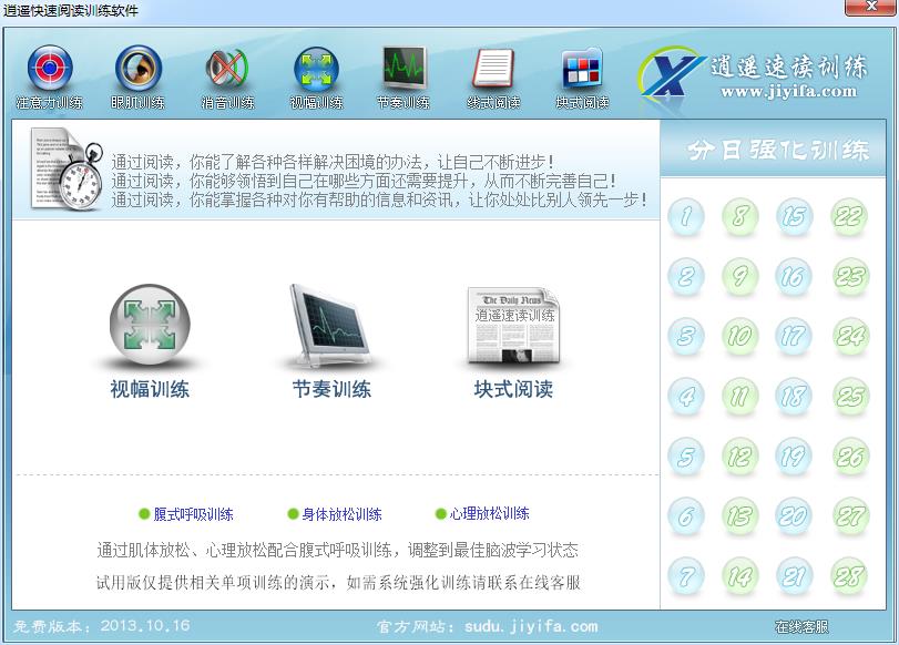 逍遥速读训练软件历时2年多的开发研制,通过我们大量的网络培训和现场培训经历而总结经验,把1V1指导做在软件中,内置了28天的训练计划任务,每一天的训练都不一样,让软件成为导师来指导大家一步一步的去怎么训练。从而达到1个非常好的效果。