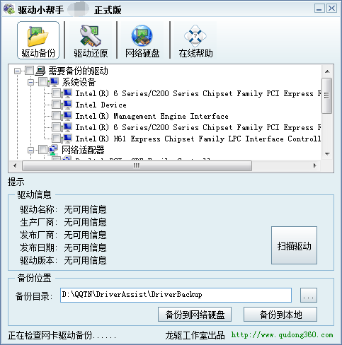 驱动小帮手是一款电脑驱动管理软件,软件提供驱动备份、驱动还原、网络硬盘等功能。用户可以使用本软件将驱动备份到本地或是网络硬盘。同时软件还可以查看每一个驱动的详细信息,包括驱动名称、生产厂商、发布厂商、发布日期、驱动版本等信息。