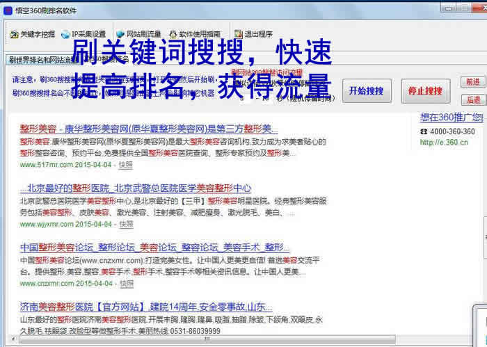软件由多名工程师历时几个月时间开发,软件中集合了360关键词采集、指数分析、一键换IP、刷网站流量、刷世界排名以及模拟人工刷360搜搜,快速模拟人工提升360排名,让你的网站获流量,从而获得收益!