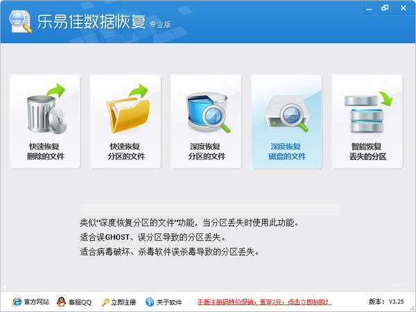 乐易佳数据恢复专业版拥有强大的数据恢复功能,它可以帮助用户恢复文件数据,包括误删文件、杀毒软件误删、病毒感染文件、文件无法访问、误格式化、硬盘坏损等,不管是什么原因造成的文件损坏或数据丢失,它都能安全快速的帮你一键恢复,有了乐易佳数据恢复软件你再也不用担心重要文件被误删了。