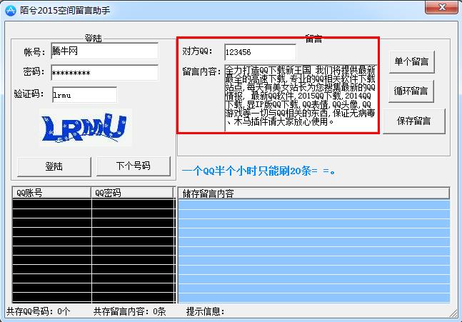 陌兮QQ空间留言助手是一款2015年最新的空间留言工具,这款工具可以帮助你一键批量留言,帮助你进行空间人气互踩互刷,另外QQ空间留言助手操作简单,你只需要登录QQ账号,然后输入对方QQ,接着设置好要留言的文字内容,保存之后就可以一键批量刷空间留言了,需要的朋友们快来下载吧!
