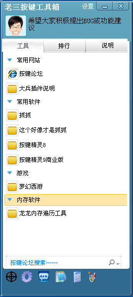 老三按键工具箱是一款绿色小巧的按键辅助工具,这款软件仿照QQ的界面打造,使用起来非常的方便,它集成了很多常用的工具,方便你进行各种操作,是玩家们游戏的好帮手!