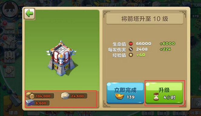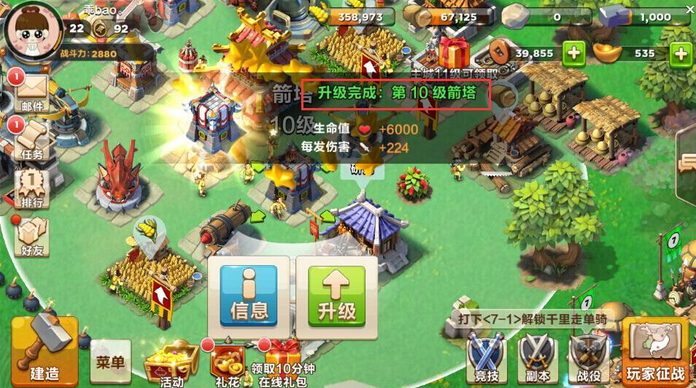 妹子这里以升级“箭塔”为例,点击主城中“箭塔”图案并会出现升级与信息字样,如图所示