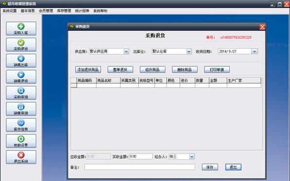 销售退货:进行已销售商品的顾客退货工作,同样可以通过商品条码和编号来选择商品。