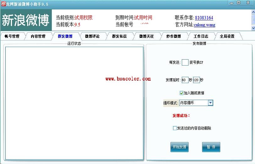 龙网新浪微博小助手是一款专为新浪微博设计的微博群发软件。现在微博这么火,很多推广人员都在微博上进行微博营销,而这款龙网新浪微博小助手可以借助微博来作为群发工具,帮助你进行营销推广,如果你也是一名推广营销人员,那么快来试试这款龙网新浪微博小助手吧。