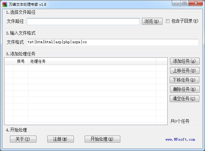 万峰文本处理专家是一款绿色小巧、简单易用的文本处理工具,这款万峰文本处理专家功能强大,可以帮助用户处理各类文本文件,目前支持txt、htm、html、asp、php、aspx、cs等文件格式。