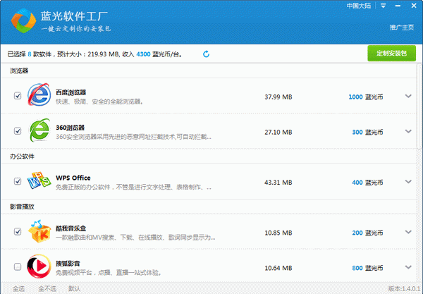 【封盘包(蓝光软件工厂)】下载后,需要选择喜欢的软件后点击定制安装包