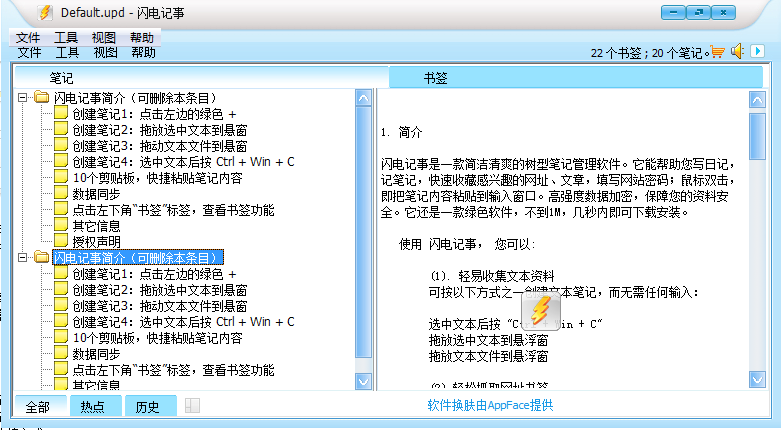 bookmarkflash闪电记事有清爽简洁的界面,是一款树型笔记管理软件。它可以用来写日记,记笔记,还可以帮助你快速收藏感兴趣的网址、文章,填写网站密码等。