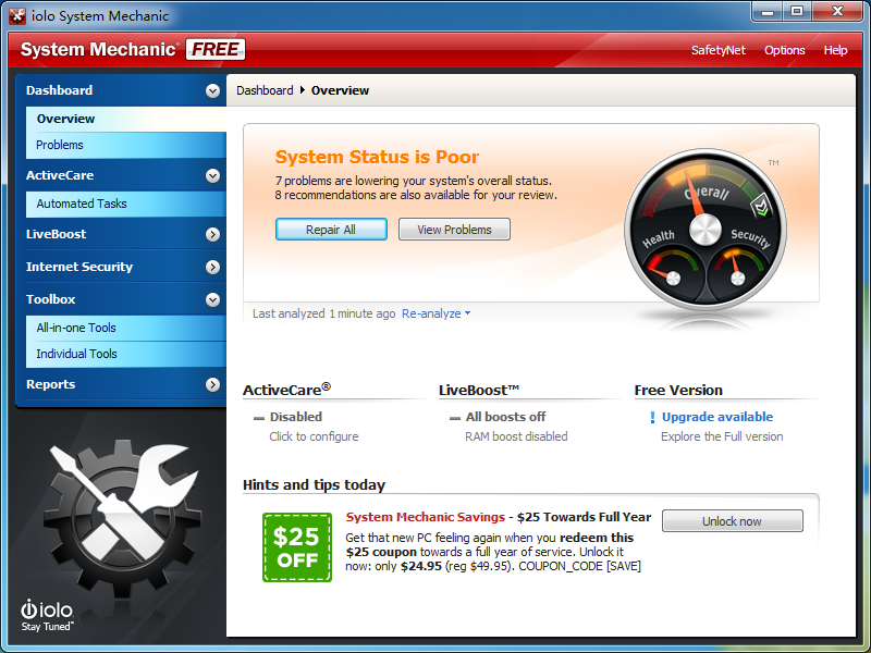 系统修理工 System Mechanic 是 IOLO 科技出品的一站式系统优化方案。比较适合经验丰富的用户,该应用程序允许你提升你的电脑的速度,稳定性和降低功耗。系统修理工有超过50个的自动工具来清理你的硬盘,修复注册表,硬盘进行碎片整理和优化存储器,系统和网络设置。