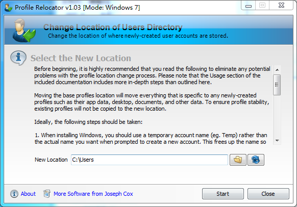 用户目录迁移工具 Profile Relocator 是一个简单的小工具,简单几步即可重新定位 Windows 系统用户资料文件夹。一旦改变过位置。任何新创建的用户都会出现在新的目录。