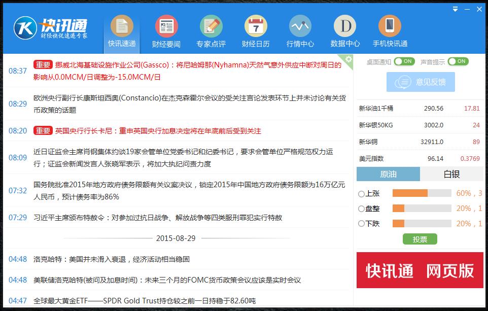 快讯通是一款专为股民推出的财经资讯以及理财投资软件,它是炒金、炒银和炒外汇最受欢迎的必备软件,全新财经日历新增判断功能,直接判断多空走势。功能强大,信息极速。软件汇聚了行业顶尖媒体的资讯和评论分析(包括汇通网、FX168、DailyFX、和讯、路透中文网、阿斯达克财经网),财经事件提醒、行情数据和ETF持仓量查看,以及交易策略参考等多种功能。