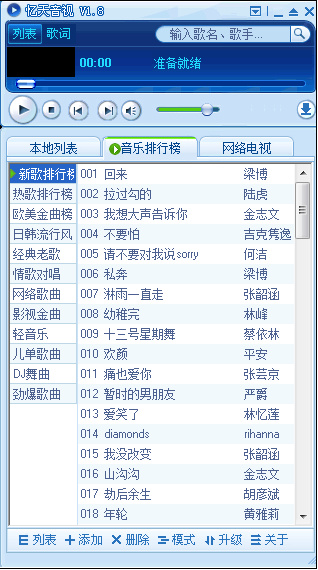 忆天音视听歌时带有歌词同步显示,曲库拥有几十万歌曲,每天更新大量新歌。通过忆天音视,用户可以方便、快捷地实现音乐查找。在线高清电视,内置几百个频频道,与电视同步播放。