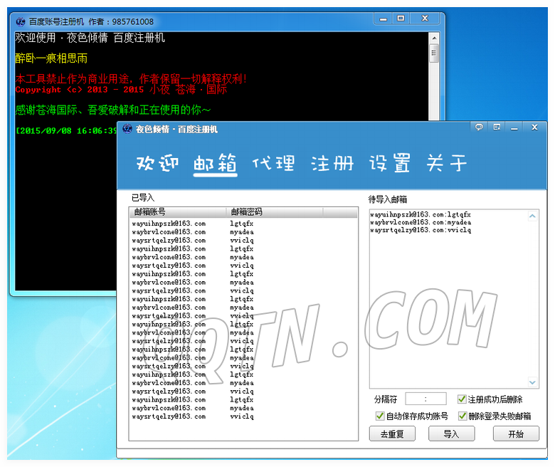 夜倾情·百度注册机可以实现全自动轻松注册百度账号,集成打码平台,支持多种注册方式和代理方式,注册效率高,稳定性好。受广大百度爱好者的青睐,被广大群众使用。