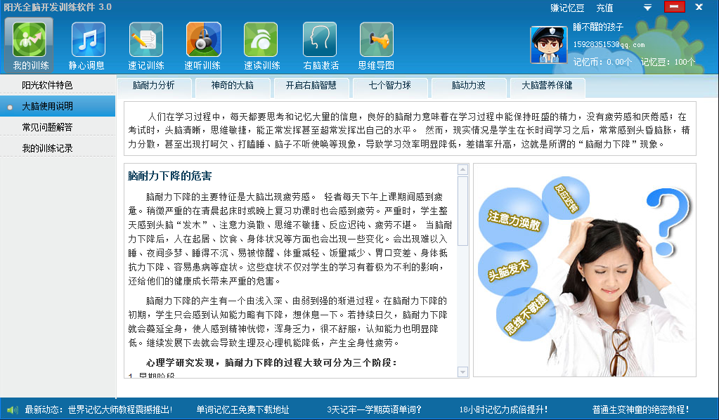 阳光全脑开发训练软件是一款打破机械式训练的记忆训练软件,这款软件用独特的方法,让脑力训练变得有趣起来,让学习变得轻松。