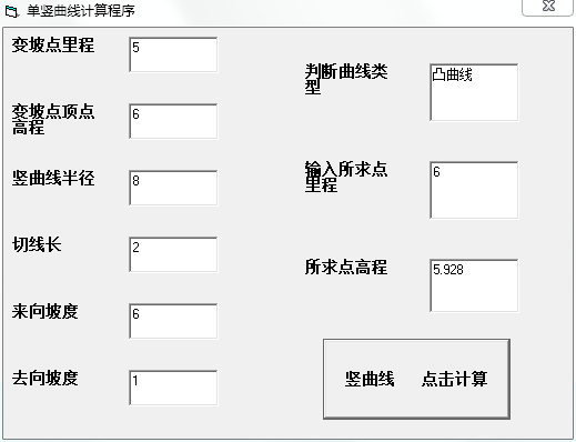 输入变坡点里程、变坡点顶点高程、切线长、来向坡度、去向坡度、所求点里程