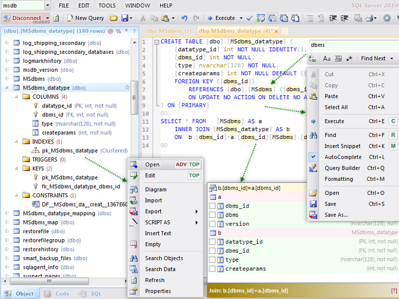 包含资料库物件浏览, 资料表与索引编修, 资料列编辑, SQL分析与调试, 指令码生成, 图像化, 列印, 汇入, 输出等多方面处理.
