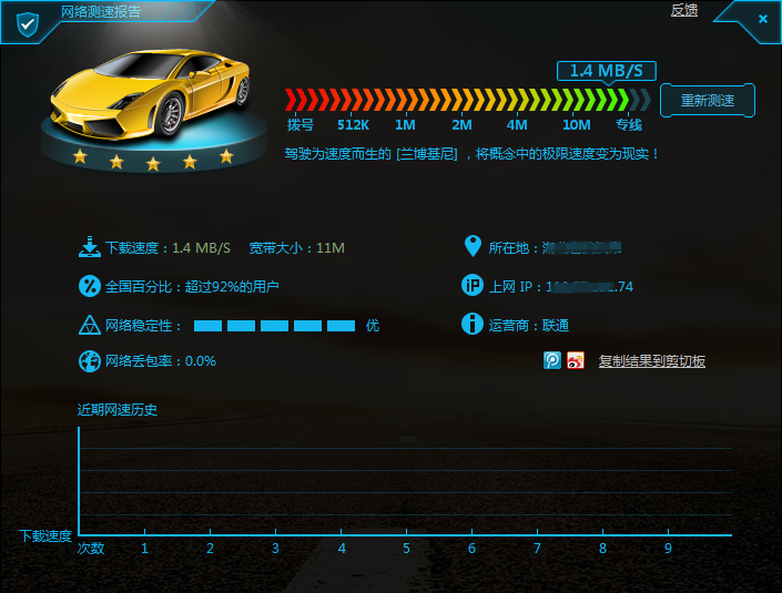 软件的功能非常的简单就是可以用来测试你的网速快慢,可以用来参考是多少兆的网速。