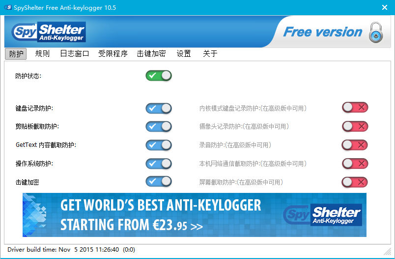 SpyShelter免费的反键盘记录软件提供了一个集成的按键加密驱动器进行加密你的按键,而你正在浏览的网页。