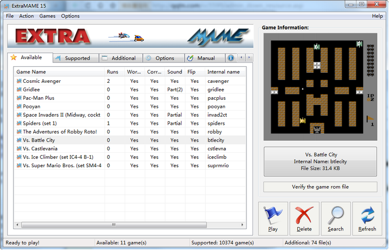 5.运行“Extra MAME”。它显示两个列表,“支持”和“可用”。