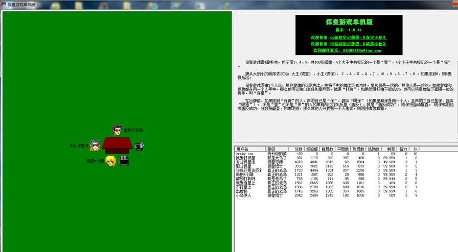 保皇单机版是由远航保皇开发的一款单机保皇游戏,这款游戏体积小巧,绿色免安装,解压即玩。不用上网、不用招集游戏伙伴,只要有电脑,就可以和电脑(模拟的游戏玩家)玩保皇游戏。 本单机版游戏无任何捆绑插件,请放心下载娱乐。
