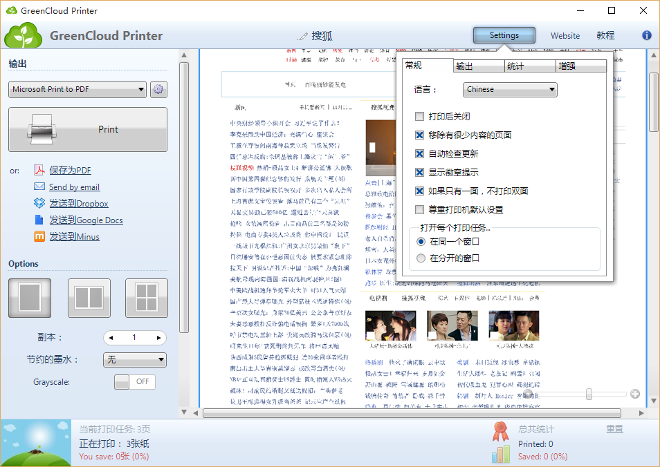 GreenCloud Printer 就是一套虚拟打印机软件,它除了可以在一张纸上同时印出1—4页文件,还可以自动省墨、转成黑白或是双面列印,更强大的是它可直接将文件存为PDF格式,甚至帮你上传到Dropbox或Google Docs文件中。