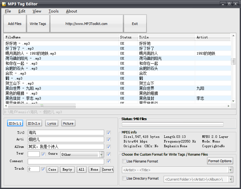 有了这个程序,你可以编辑MP3标签信息批处理模式。