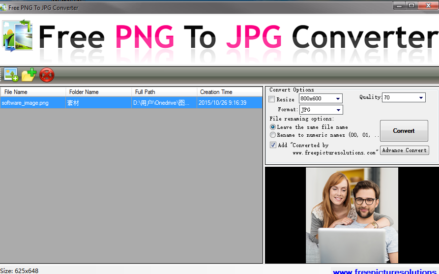 多格式转换器PNG to JPG Converter是免费的图片解决方案带给你另一种图像格式转换器应用程序。正如名字一样,它与PNG扩展为JPG最流行的图像格式转换您的图像。 JPG广泛应用于几乎任何数码相机等数字成像装置以及在计算机的应用程序。几乎所有的标准成像应用程序支持JPG扩展。