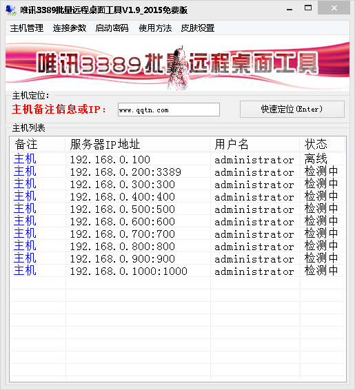 唯讯3389批量远程桌面工具2015年最新免费版,支持批量登录服务器,支持一键全连,一键关闭,免去了频繁输入切换账号密码的烦躁,批量导入等多个实用功能,为公司网管/服务器管理员的极佳工具。