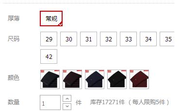 软件中"商品选择参数"下方的选择框就对应着商品链接页面里的标识,比如尺码、颜色等等 后面的1、2、3等数值分别对应着商品页面链接里选择分类里勾选位置,比如软件中尺码数值为2就代表尺码30,以此类推,1代表尺码第一个的29、3代表尺码31,上图中就需要将尺码、颜色数值写好,然后点击进软件中点击"增加至商品参数列表"按钮即可,软件下方就会显示相应的参数,这样软件在自动抢购成功后才可以自动勾选相应的尺码以及颜色,如果打开商品页面链接里有些参数自动勾选了,就不需要写进软件里了,比如上图中"厚薄"这个分类,页面自动已经勾选上了就无需添加进软件里了,另外比如页面里含有软件中不存在的分类名时,比如这个,这个长度分类在软件中根本找不到,这时你自己添加分类,就是在软件"商品选择参数"下方直接输入长度,然后选择相应的数值,点击"增加至商品参数列表"按钮就会显示到下方列表里。如果添加的某行有误,可以先选择某行,然后点击"删除指定行"按钮删除,也可以选择"清空所有"按钮全部删除添加的分类和数值。所有都添加完成检查下软件中的分类数值是否和商品链接里的分类想对应,最后点击确认按钮进行确认,然后就会显示到主页面的"自定义抢购"下方的列表里,同样自定义抢购这个列表里也存在"删除指定行"和"清空所有"按钮,用户可以根据需要操作。