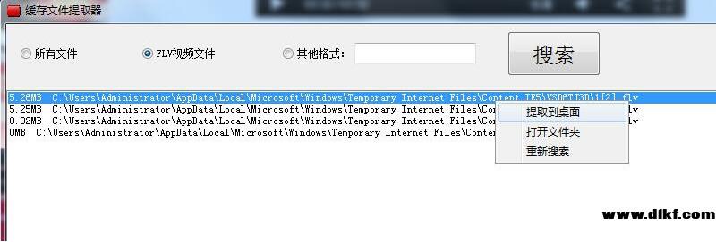 2、然后选择《缓存文件提取器》中的“FLV视频文件”并点击“搜索”按钮。