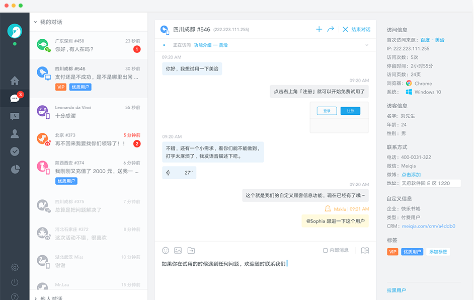 从顾客进入网站时,美洽就考虑到了触及顾客的各种方面,通过友好流畅的连接和沟通,可显著提高营销转化率。
