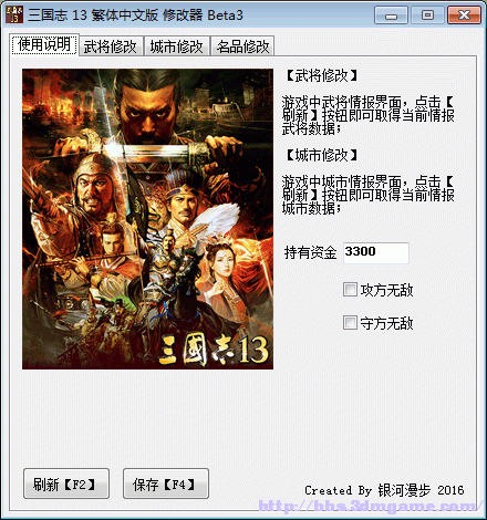 三国志13修改器繁中版是一款专门针对San13制作的武将和城市修改器,这款修改器由3DM论坛 @银河漫步 制作分享,这款三国志13修改器可以帮助玩家进行城市修改、武将修改和名品修改,喜欢玩三国志13的朋友千万不要错过这款超强修改器!