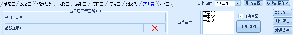洛克王国绝世辅助是洛克王国辅助史上最完美的辅助工具,本辅助是一款多功能全能辅助工具,辅助主要包括信息区、宠物区、洛克助手、人物区、娱乐区、每日区、每周区、迷之岛、彩图赛、WPE区等几个大的方面。多方位为为玩家提供最好用的辅助功能。