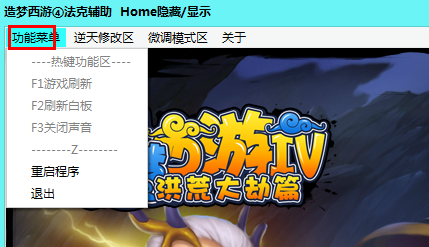 造梦西游4法克辅助按HOME键隐藏、显示主窗口,主要将功能分为功能菜单、逆天修改区、微调模式区、功能1区、高仿CE五大类型。