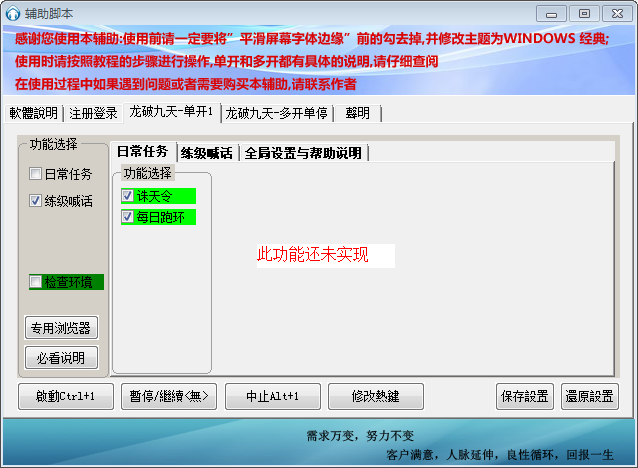 龙破九天辅助脚本支持诛天令、每日跑环、一键主线48级、喊世界以及喊附近等功能,本脚本分为单开和多开单停版,支持免费试用。