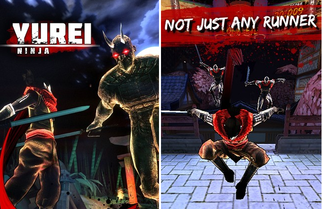 《幽灵忍者 Yurei Ninja》是一个跑酷游戏,讲述的一个行动神速的忍者复仇的故事,游戏玩法和《神庙逃亡》类似,左右上下划动控制忍者移动、跳跃等动作,而当敌人迎面杀来时,控制忍者跳跃或下滑即可攻击敌人,而且游戏时,视角还会突然变化,敌人会从身后杀来,或用暗器偷袭,非常考验玩家的反应。