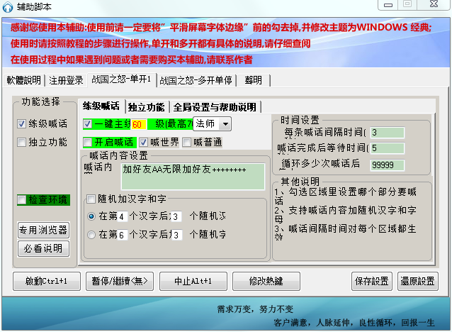 使用战国之怒辅助脚本修改任何功能都要点击保存后,重新启动辅助才能生效,并且电脑屏幕必须保持常亮状态脚本才会持续运行。