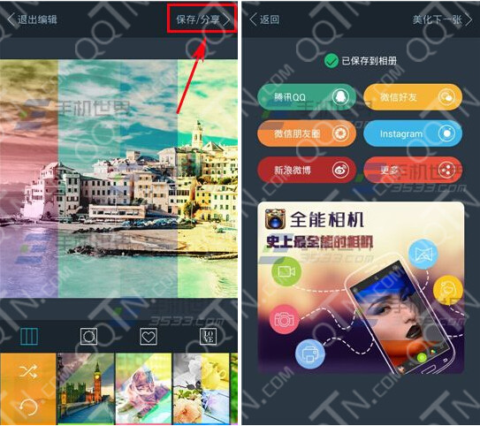 3)接着选择【保存/分享】按钮,该照片就会保存到本地相册了,现在你可以分享到社区上啦。(如下图)