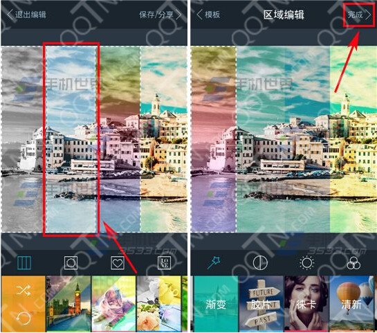 2)接着到选择模板的页面,选择自己喜欢的拼接【模板】,接着点击其中一款【区域】进行区域编辑,你可以给该区域更换各种滤镜,调色亮度饱和度等,发挥你的想象力,每块区域都调完色后呢点击右上角【完成】按钮。(如下图)