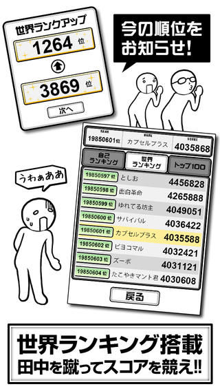 游戏还设有排行榜,你可以看到自己在世界排行榜中排名第几位。我们在美剧中常常会看到kick your ass这个词,现在终于在这个游戏中可以实现了呵呵。快来玩《爆踢田中》吧,一遍踢一边欣赏田中们那贱贱的表情!