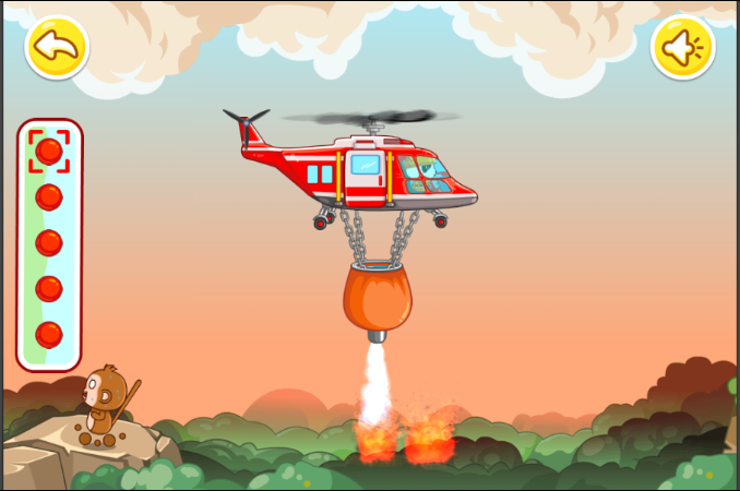 孩子需要根据着火地点选择正确的灭火设备参与到灭火救援行动中,通过点击、滑动等操作来扑灭大火,拯救危机的小动物们。