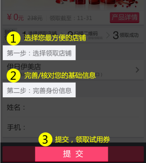 1、选择带有“到店领取”图标的产品进行领取,选择您方便的店铺并填写个人基本信息,提交即可获得试用券一张;
