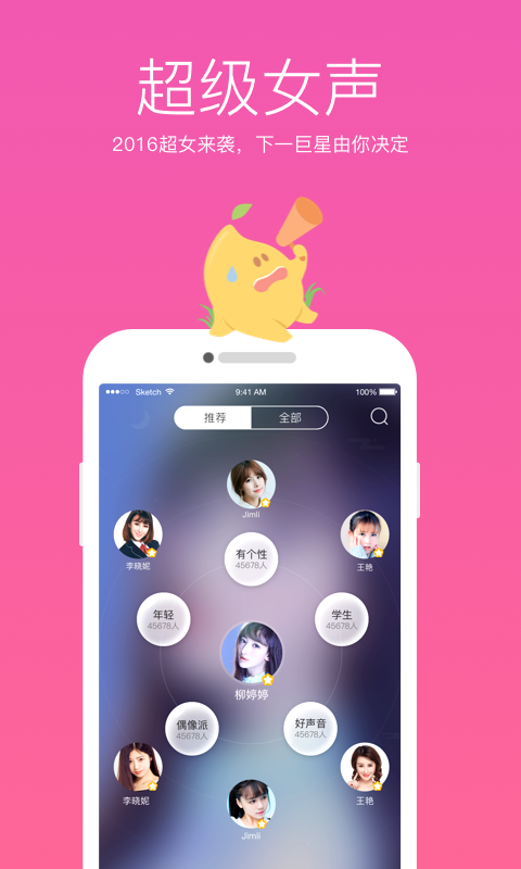 汇集千万粉丝与最具人气的偶像新星,歌神天后,惹天王竞折腰的网络红人,会唱歌的厨师,能说会道的奇葩奇才,鲜肉男主播,萌妹御姐,过目不忘的路人丙...巨星成长之路从这里开始!