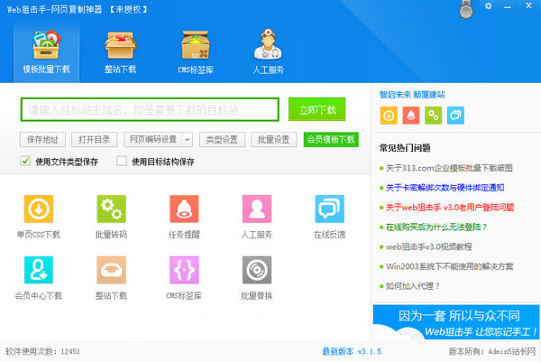 WEB狙击手是一款专为站长提供一站式解决网站服务的工具,从建站到后期网站维护提供一条龙服务。您可以使用WEB狙击手快速复制网站模板及处理各种网站相关疑难问题。