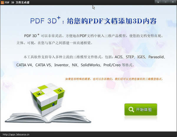 PDF 3D文档生成器是一款专业的办公软件,这款软件最大的特点在于能够方便灵活地在PDF文档中插入3D模型,让你的文档变得直观、立体、可视,支持多种主流的三维模型文件格式,包括ACIS、STEP、IGES、Parasolid、CATIA V4、CATIA V5、Inventor、NX、SolidWorks、Proe/Creo等格式。