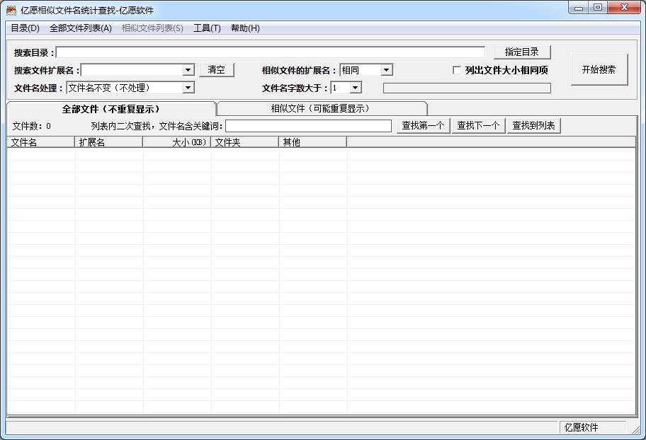 亿愿相似文件名统计查找工具可以帮助你对相似的文件名进行快速统计查找、搜索,支持文件名相同的文件,加以列表显示,便于浏览文件、删除重复文件、修改文件名、再次用不同的关键词查找文件、打开所在目录并且定位到文件、用记事本打开文件……功能全面而专业。