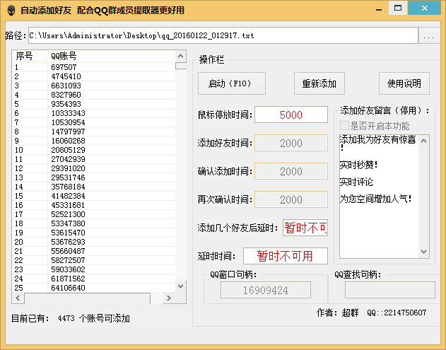 QQ自动添加好友软件是2016年最新的QQ自动批量加好友软件,这款软件专为QQ推广营销人员设计制作,它可以帮助你一键批量加QQ好友,如果用这款软件配合QQ群成员提取器将更加好用,先一键提取群成员,保存QQ号码信息为txt文档到本地之后,再通过这款软件批量加好友,所有的繁琐操作只需两步完成,效率非常高!