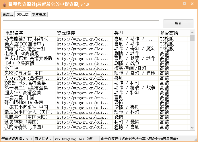帮帮您云盘资源器是一款免费绿色小巧的网盘资源搜索下载神器,这款软件简单实用且功能强大,帮帮您云盘资源器可以帮助你搜索各种云网盘资源,拥有海量电影资源,支持搜索百度云资源、360云盘资源。软件界面清晰,操作简单,拿到即可观看最新最全的电影,想看什么看什么,需要的话可以来下载使用。