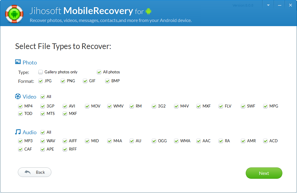 Jihosoft Android手机恢复可以恢复你想要从扫描结果来选择他们。您可以恢复某些类型的数据或只是标记你想要的物品。