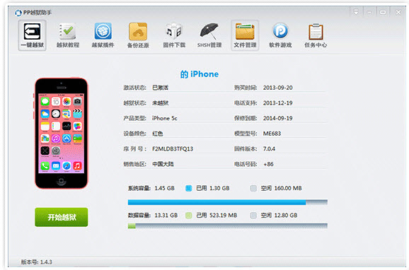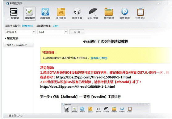 接入你的设备,从固件3.1开始,一直到5.1.1都可以完美支持越狱。PP越狱助手会根据用户的设备调出相应的工具与越狱方法,从此省去了用户因为硬件不同和固件不同查找相应越狱工具的麻烦。